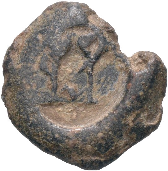 The block monogram contains several certain and a few uncertain letters. Not all of them are necessarily used to give the key word. From left to right: V, P (reverse), Ι, N (reverse), A, M, Λ, Ο. Excluding the Λ, the remaining letters form the name MAVPIANOV. The reverse N is attested, albeit rarely, in block monograms of the early period (e.g. Zacos, 1, plate 241, no. 438 and plate 245, no. 234A).