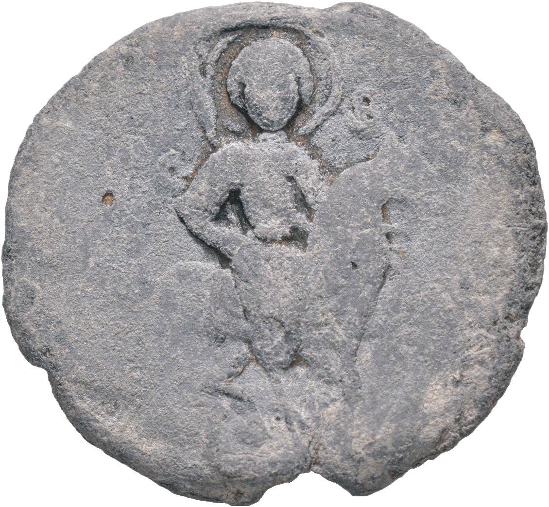 Saint Georgios on horseback, moving to the right, holding a spear (r. hand) and the leash (l. hand); on either side, vertical inscription arranged in horizontal lines