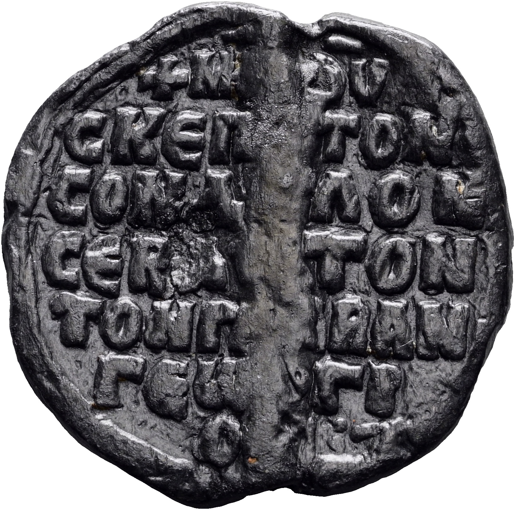 At the end of the sixth row on the reverse, the craftsman intended to put a letter after the iota, but reconsidered, probably because he could still not end the text there, and deleted it; its traces, however, are visible. At the end of the seventh row, the craftsman was perhaps confused with the ending of the inscription, probably because of the deleted letter above, and ended it with a colon followed by a dash; there is nothing to the left of the omicron though.